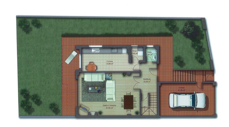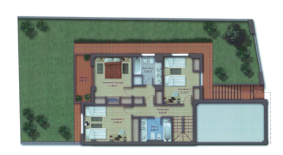 Chalet adosado y pareado de 232,75 m² útiles en parcela de 213,55 m² aproximadamente. Cuenta con tres dormitorios, dos baños completos, buhardilla y garaje para un coche.